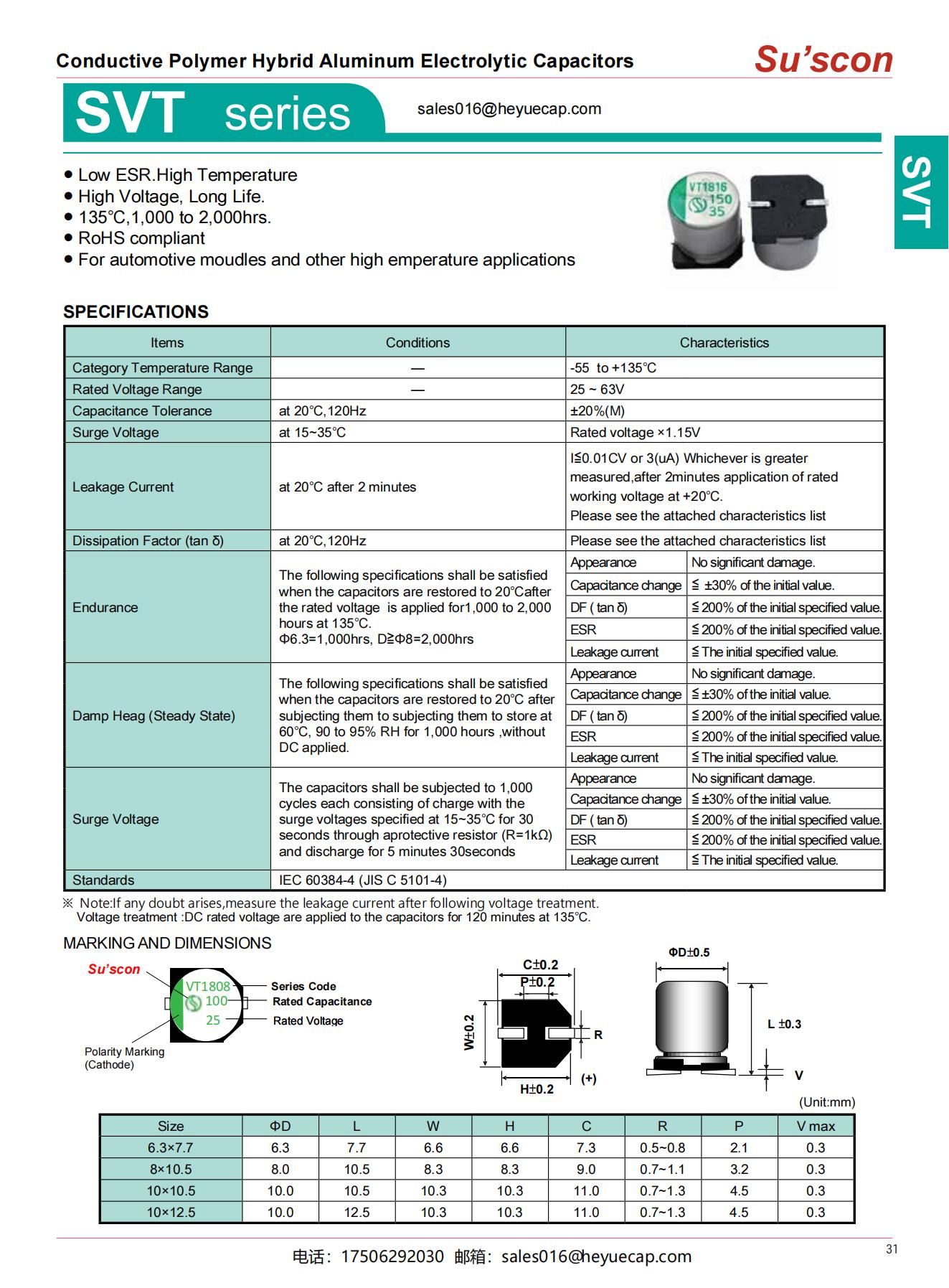 ● Low ESR.High Temperature● High Voltage, Long Life.● 135℃,1,000 to 2,000hrs.● RoHS compliant● For automotive moudles and other high emperature applications